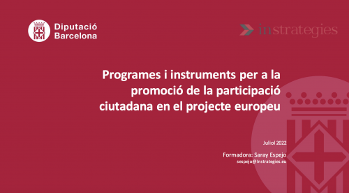 Saray Espejo directora d’Afers Europeus a Instrategies, és la formadora del curs de la Diputació de Barcelona “Programes i instruments per a la promoció de la participació ciutadana en el projecte europeu”. El curs, adreçat a personal tècnic dels Ajuntaments i Consells Comarcals de la província vol promoure la participació dels ens locals en els programes europeus. El curs es desenvolupa en 3 sessions al llarg del mes de juliol de 2022.