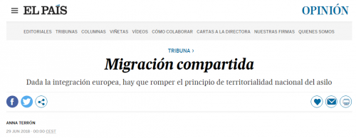 Contribución de Anna Terrón en El País sobre Migración compartida: "Dada la integración europea, hay que romper el principio de territorialidad nacional del asilo". En https://elpais.com/elpais/2018/06/27/opinion/1530118602_035049.html