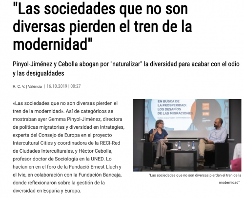 "Las sociedades que no son diversas pierden el tren de la modernidad" en https://www.levante-emv.com/comunitat-valenciana/2019/10/16/sociedades-son-diversas-pierden-tren/1933408.html (castellano) o https://val.levante-emv.com/comunitat-valenciana/2019/10/16/sociedades-son-diversas-pierden-tren/1933408.html (català)