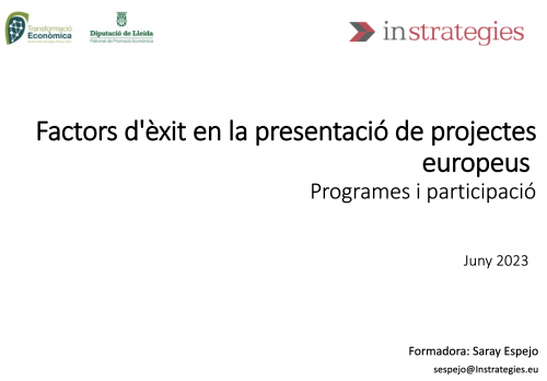 Saray Espejo, directora d'Afers europeus a Instrategies, ha participat en el Curs “Factors d’èxit en la presentació de projectes europeus” organitzat per la Diputació de Lleida. En aquest curs s’ha assolit tota una sèrie d’objectius, com conèixer els fons europeus disponibles per a ens locals, aprendre a cercar convocatòries i plans de treball i conceptualitzar els projectes i cerca de socis, entre d’altres.
