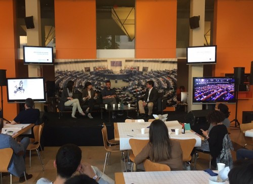 Saray espejo participa al debat sobre la campanya i les eleccions europees a Espanya i Catalunya, organitzat per l'Oficina del Parlament Europeu a Barcelona amb la col·laboració de la Facultat de Comunicació Blanquerna i Relacions Internacionals Blanquerna - Universitat Ramon Llull, a la Plaça de Joan Coromines.